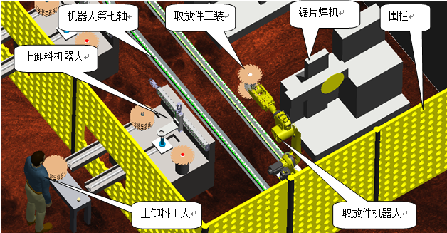 機器人主要實現(xiàn)鋸片焊接的上下料。