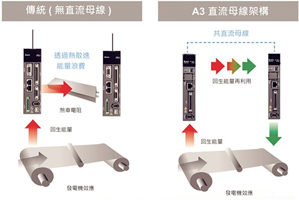 多軸共直流母線設(shè)計,保持直流母線電壓穩(wěn)定,回生能量再利用,機械設(shè)備更節(jié)能