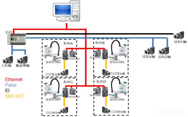 該方案采用高生產適應性的流水線架構,模塊化構成,通過“自動化取放料站概念”和“視覺辨識”實現(xiàn)快速換料或擴種物料種類的動作,方便實用。同時,該方案采取臺達DMCNET總線架構,實現(xiàn)“分類-包裝”整線運行,與不同上位架構結合,更具彈性。系統(tǒng)架構如圖1所示。