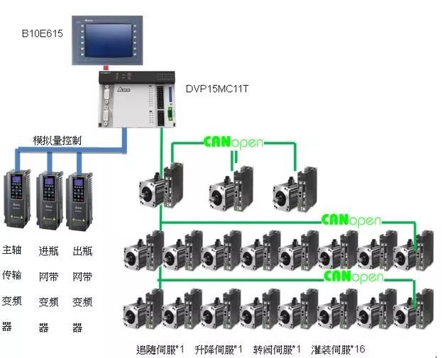 在這一方案中,灌扎線的系統(tǒng)控制全部由臺達(dá)多軸運(yùn)動控制器DVP-15MC系列統(tǒng)一調(diào)配。搭配伺服驅(qū)動系統(tǒng)ASDA-A2系列,進(jìn)行追隨、升降、轉(zhuǎn)閥、灌裝等。而進(jìn)瓶網(wǎng)帶、出瓶網(wǎng)帶和傳輸線則由臺達(dá)變頻器負(fù)責(zé)。