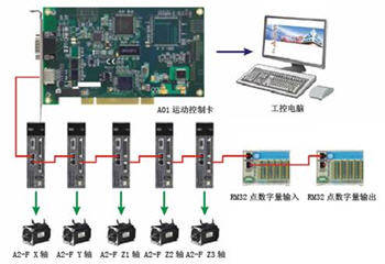 PCB鉆孔機(jī)的運(yùn)動(dòng)控制系統(tǒng)架構(gòu)A01運(yùn)動(dòng)控制卡1張。X軸5.5kW A2-F伺服、Y軸5.5kW A2-F伺服、Z1軸750wA2-F伺服帶兩個(gè)主軸、Z2軸750W A2-F伺服帶兩個(gè)主軸、Z3軸750W A2-F伺服帶兩個(gè)主軸。圖4為運(yùn)動(dòng)控制架構(gòu)示意圖。