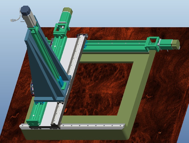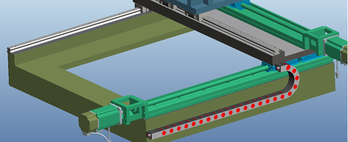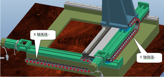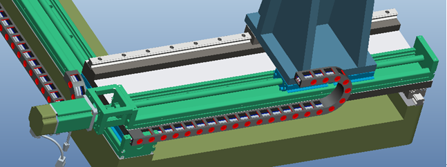 為了提高Y軸的抗變形,減小單軸運動帶來的打擾度,X軸結(jié)構(gòu)上采用KK模組和直線導(dǎo)軌的雙軸設(shè)計,其能確保Y軸結(jié)構(gòu)件的穩(wěn)定,同時X軸底座采用整體鑄鋁加工而成,有助于提高產(chǎn)品整體設(shè)計的剛度,確保使用過程中結(jié)構(gòu)穩(wěn)定可靠。具體結(jié)構(gòu)如下: