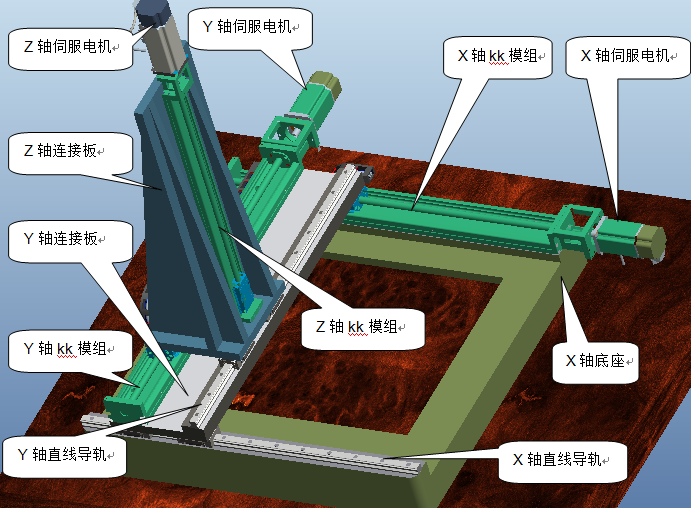 為了提高Z軸的抗變形及抗沖擊能力,Y軸結(jié)構(gòu)上采用KK模組和直線導(dǎo)軌的雙軸設(shè)計,其能確保Z軸結(jié)構(gòu)件的穩(wěn)定,提高產(chǎn)品整體設(shè)計的剛度,確保使用過程中結(jié)構(gòu)穩(wěn)定可靠。具體結(jié)構(gòu)如下: