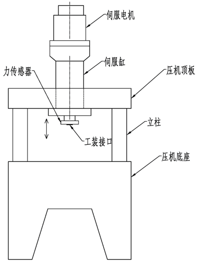 1. 伺服壓機由壓機底座、立柱、壓機頂板、伺服電缸、伺服電機、伺服驅動、力傳感器、觸摸屏、PLC、光幕、低壓元器件及控制柜等組成。位移值通過伺服電機及伺服缸精確控制,擠壓過程中的阻力由力傳感器直接檢測;通過力、位移值的采集,以及外部固有參數(shù)(工裝號、粉末重量等)的輸入,可以實時反應力、位移及密度三者的對應變化曲線。此外壓機設置有光幕,以確保實驗過程中人員的安全。