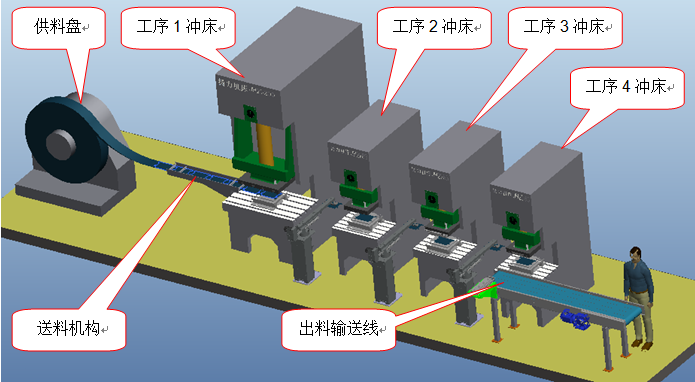 此生產(chǎn)線主要完成機(jī)頂盒外殼的沖壓工作。主要由供料系統(tǒng)、沖孔落料工位、凸臺(tái)成型工位、小邊折彎整形工位、外殼成型工位、搬運(yùn)系統(tǒng)、出料輸送線等構(gòu)成。