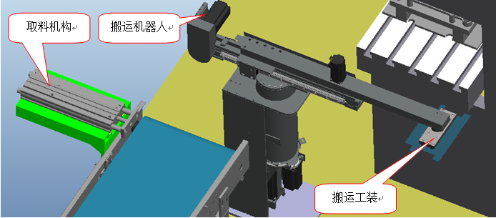 其主要功能是對機(jī)頂盒外殼成型工序末端沖床取料,并將工件傳送到安全范圍方便人工卸料碼放。