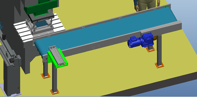10) 出料輸送線的的取料機(jī)構(gòu)將成型好的外殼從外外殼成型工位取出并放到輸送線上,由輸送線將外殼傳送到遠(yuǎn)離沖床位置,方便人工碼放。