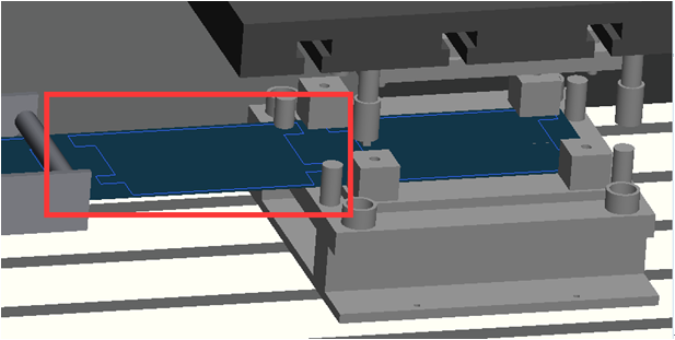 4) 工序2:凸臺(tái)成型;沖壓模具基本可以利用現(xiàn)有模具,只需旋轉(zhuǎn)180°裝配;可能需要調(diào)整抬模高度。同時(shí)薄膜面下。