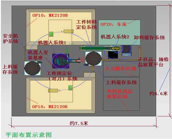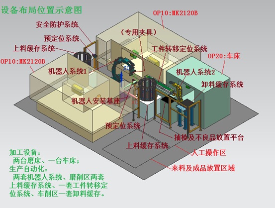 該自動(dòng)生產(chǎn)線(xiàn)由OP10磨床2臺(tái)、OP20車(chē)床1臺(tái)、機(jī)器人系統(tǒng)2套(含夾具及基座)、磨床上料緩存系統(tǒng)2套(含預(yù)定位對(duì)刀系統(tǒng))、工件轉(zhuǎn)移定位系統(tǒng)1套(含抽檢及放置平臺(tái))、OP20卸料緩存裝置1套、安全防護(hù)系統(tǒng)和電器控制(本方案中未作示意)系統(tǒng)組成。