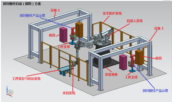 該方案屬于客戶生產(chǎn)線的技術(shù)改造方案,以提高作業(yè)效率、降低工人勞動強(qiáng)度、預(yù)防作業(yè)安全為基本目的。整個(gè)系統(tǒng)包括:機(jī)器人系統(tǒng)、夾具系統(tǒng)、安全防護(hù)系統(tǒng)、工件暫存與轉(zhuǎn)運(yùn)系統(tǒng)、電器控制系統(tǒng)及安裝基座等構(gòu)成。