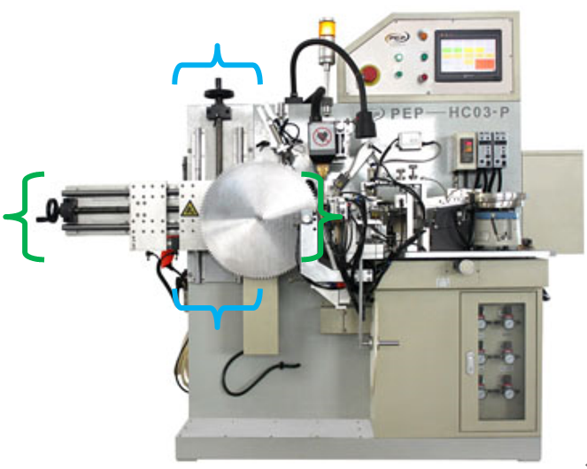 為了取放工件時機器人有足夠的空間活動,避免與鋸片焊機的干涉,需要對焊機上裝載工件的兩個活動軸進行自動化改造(下圖括號標記區(qū)域)。