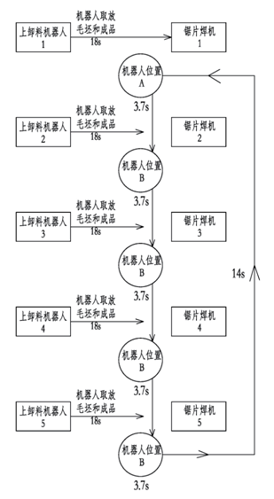 因為每臺焊機都有一個上卸料機器人,故只需要在焊機焊接時間2分鐘內完成即可。具體節(jié)拍如下: