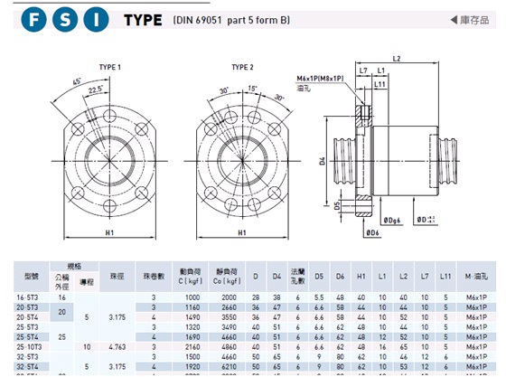 3、計(jì)算出絲杠的軸向負(fù)載以后,選型會(huì)出現(xiàn)兩個(gè)分支,一種情況是客戶不知道設(shè)備的設(shè)計(jì)壽命年限,以及每一年中絲杠的使用平率,不做精確的絲杠壽命校核。那么我們推薦一種簡(jiǎn)單可行的方法,就是查詢絲杠資料中的動(dòng)負(fù)荷值C。結(jié)合第7項(xiàng)精度0.1mm的要求,我們推薦常備FSI螺帽形式的絲杠,尺寸參數(shù)表如下:
