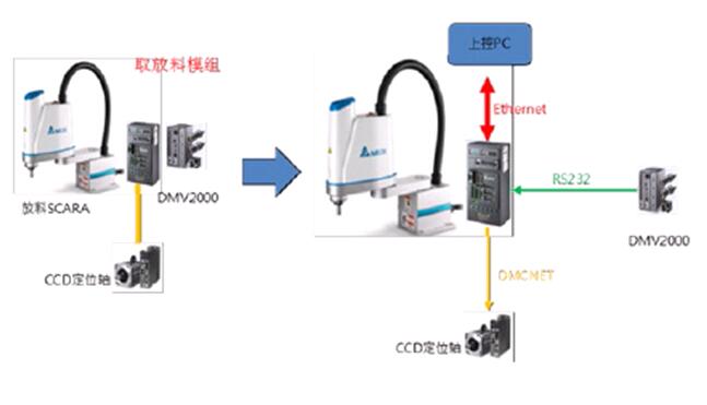 在該方案中,臺(tái)達(dá)提供4臺(tái)SCARA工業(yè)機(jī)器人DRS60L系列、4套新一代多鏡頭機(jī)器視覺(jué)系統(tǒng)DMV2000-80GX,并為螺絲檢測(cè)包裝制程提供程序編寫指導(dǎo)、SCARA使用培訓(xùn)、DMV2000-80GX設(shè)定與軸控API使用教學(xué)以及各軸之間的伺服調(diào)節(jié)協(xié)助。該方案采用高生產(chǎn)適應(yīng)性的流水線架構(gòu),模塊化構(gòu)成,通過(guò)“自動(dòng)化取放料站概念”和“視覺(jué)辨識(shí)”實(shí)現(xiàn)快速換料或擴(kuò)種物料種類的動(dòng)作,方便實(shí)用。同時(shí),該方案采取臺(tái)達(dá)DMCNET總線架構(gòu),實(shí)現(xiàn)“分類-包裝”整線運(yùn)行,與不同上位架構(gòu)結(jié)合,更具彈性。
