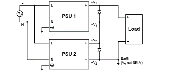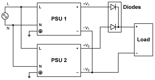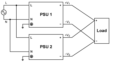 電源可以串聯(lián),以增加輸出電壓,如圖5所示。注意,只能使用來(lái)自同一產(chǎn)品系列、同等額定輸出電流的電源。