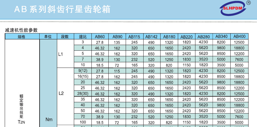 (5) 假設(shè)我們選擇:fs=1.3,則TC2= Tr2*1.3=114.6*1.3=149Nm;下一步查詢表格,要求選擇的減速機的額定輸出扭矩大于TC2這樣減速機就能滿足使用要求: