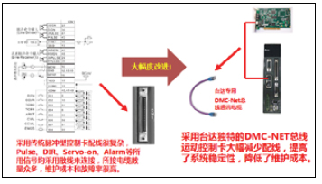 ■ 配線簡單,獨(dú)特的臺達(dá)DMC-NET, 大大減少控制端配線,減少了系統(tǒng)的可靠性,降低了維護(hù)成本,如下圖。