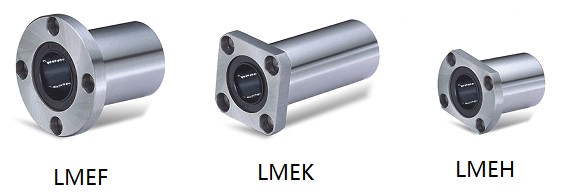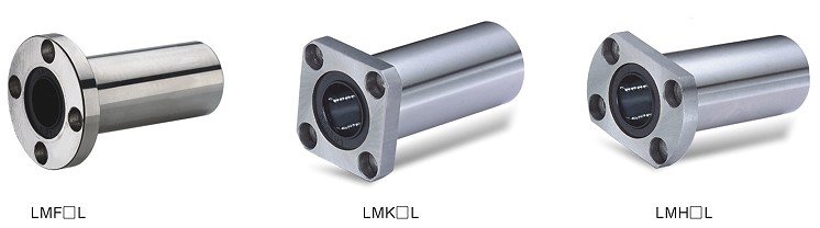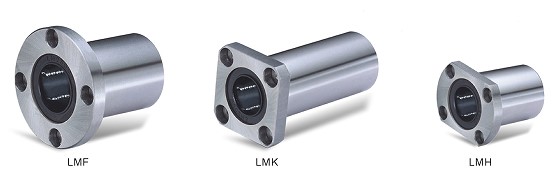 直線軸承的種類住了圓筒型以外,還有法蘭型產(chǎn)品。如圖4所示,法蘭型有三種規(guī)格,主要區(qū)別是法蘭的形式不一樣。LMF(圓法蘭),LMK(方法蘭),LMH(雙切邊法蘭)。對應(yīng)的也有加長型產(chǎn)品,增加后綴L即可。