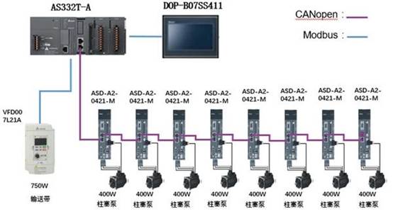 臺達直線灌裝設(shè)備控制解決方案主要采取可編程控制器(PLC)AS300系列加AS-FCOPM通訊功能卡、伺服驅(qū)動器ASDA-A2系列通過CANopen總線,利用臺達專屬驅(qū)動模式的便捷指令實現(xiàn)灌裝軸的精確控制。